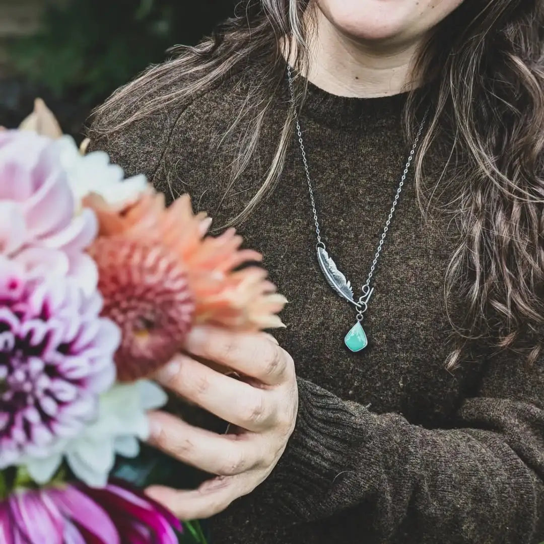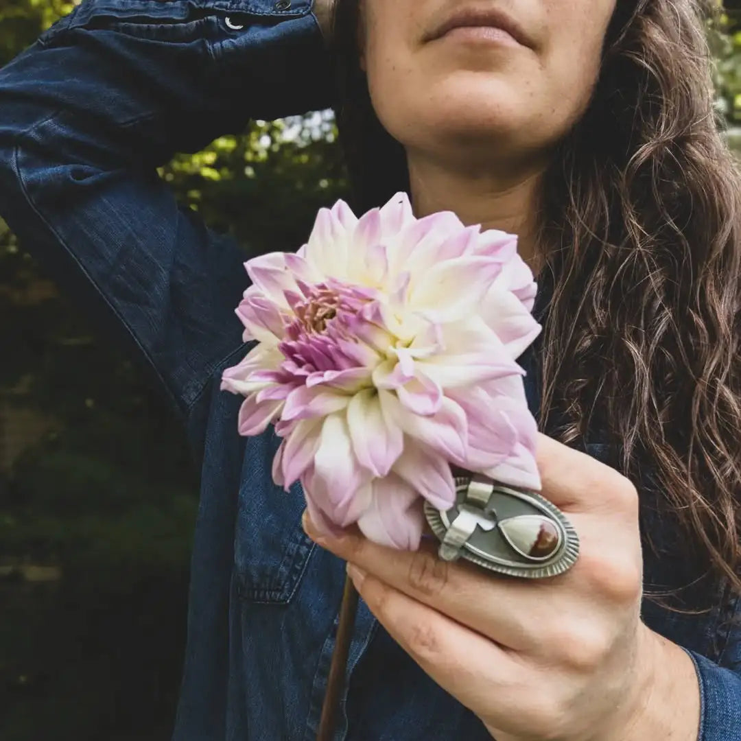 Using sterling silver as the foundation of her pieces, Samantha often adds hand-selected cabochons and beads to enhance the natural aesthetic. Whether a finely detailed botanical pendant or a bold statement ring, her work exudes a timeless, handmade quality that makes it feel both modern and rooted in tradition.