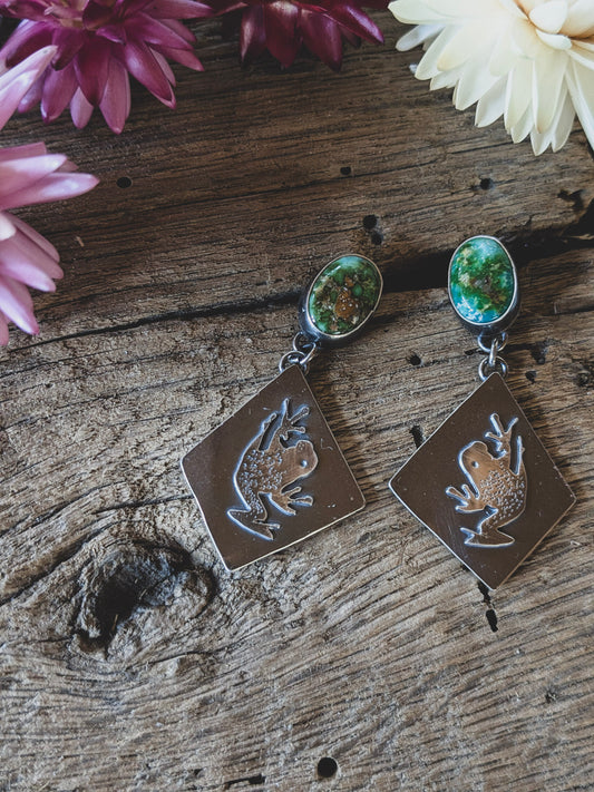 Tree Frog & Sonoran Gold Turquoise Post Dangle Earrings