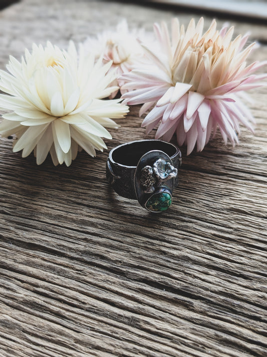 Handmade Sterling Silver Sonoran Gold Turquoise Ring – Fern & Mushroom Design