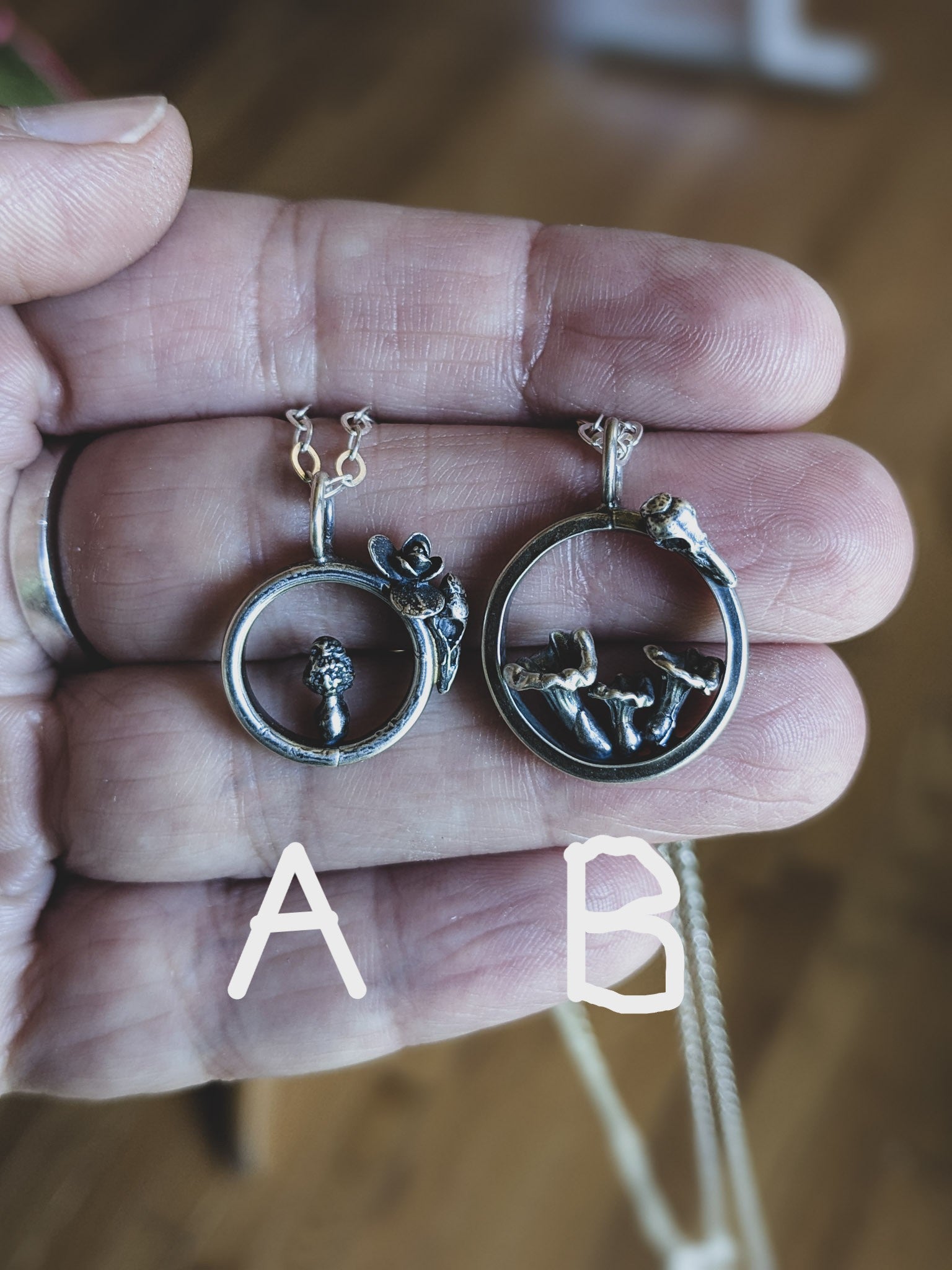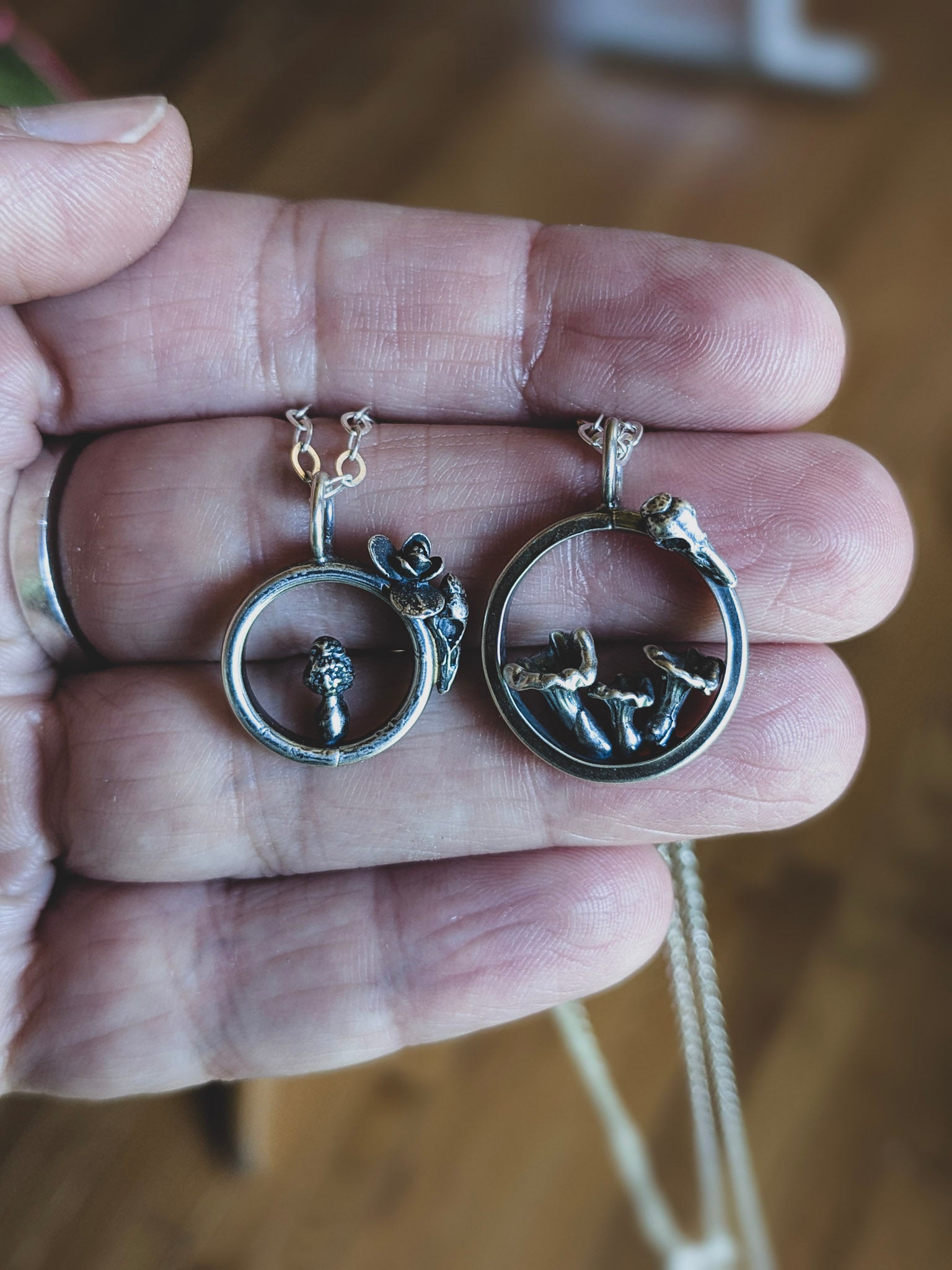 The outer ring is adorned with hand-carved raven skulls and blooming flowers, intertwining themes of life, decay, and renewal. Whether you're drawn to the golden fan of the chanterelle or the intricate ridges of the elusive morel, these necklaces are designed to tell a story—yours.