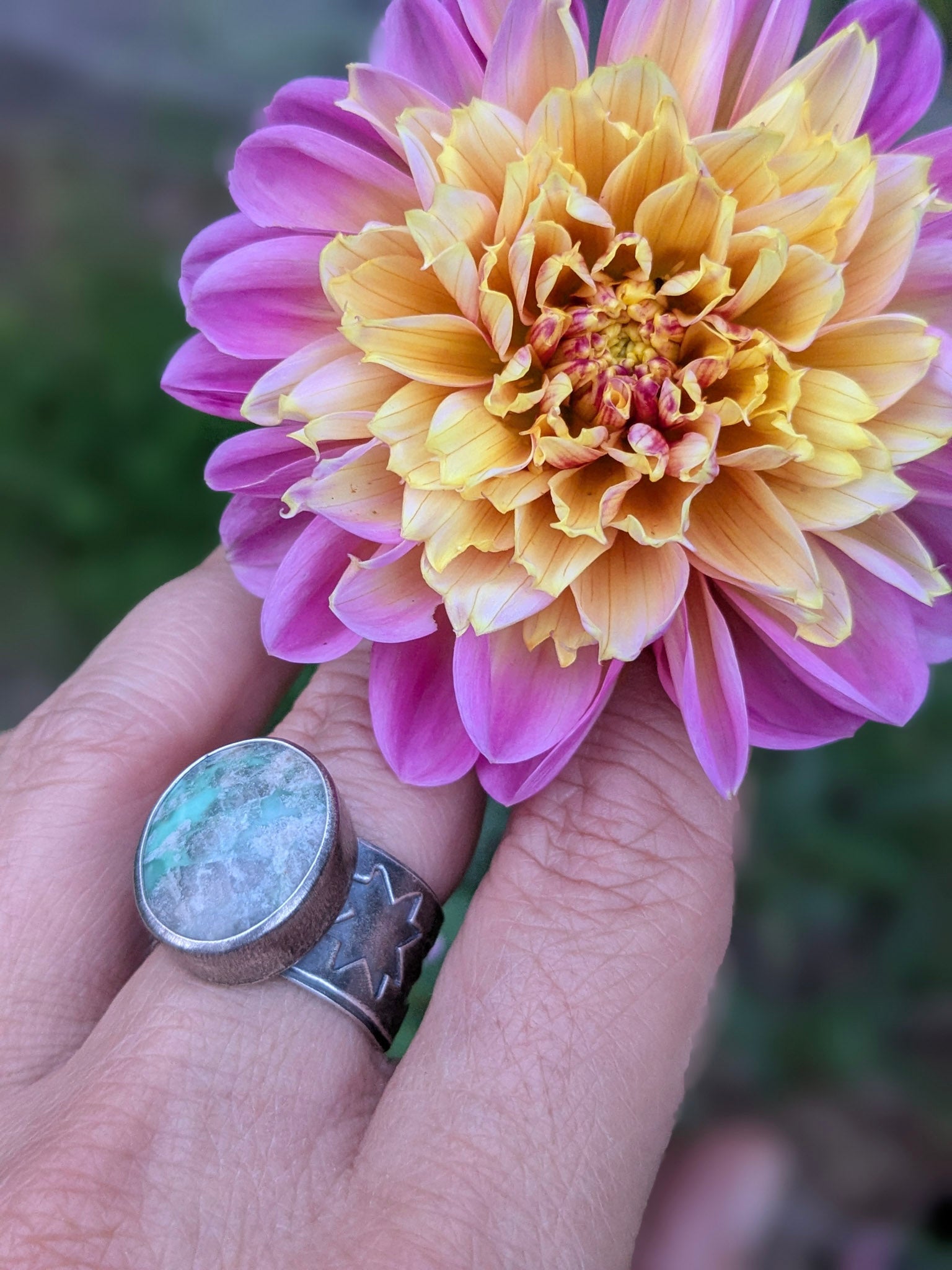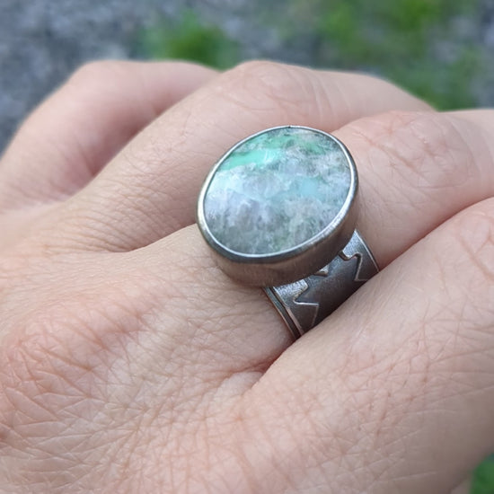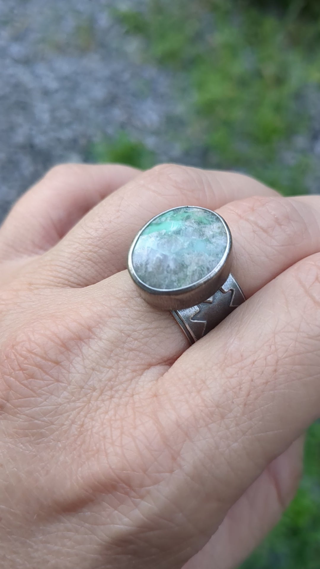 Wrap your finger in craftsmanship, heritage, and beauty. This handmade sterling silver ring features a stunning hand-cut Lucin Variscite stone, known for its dreamy mint green tones and natural matrix patterns. The gemstone is bezel-set and showcased with care, allowing its unique character to shine through.