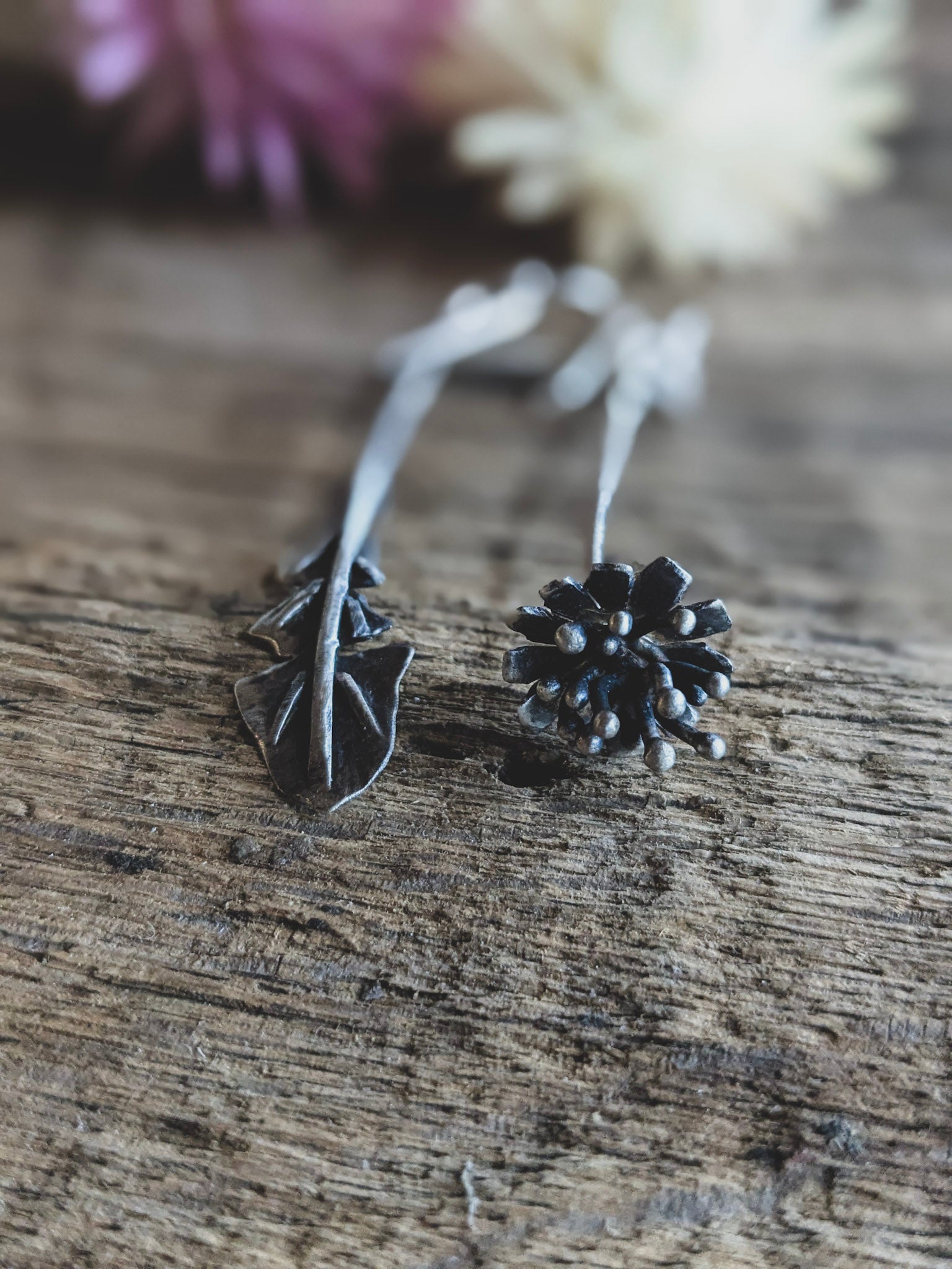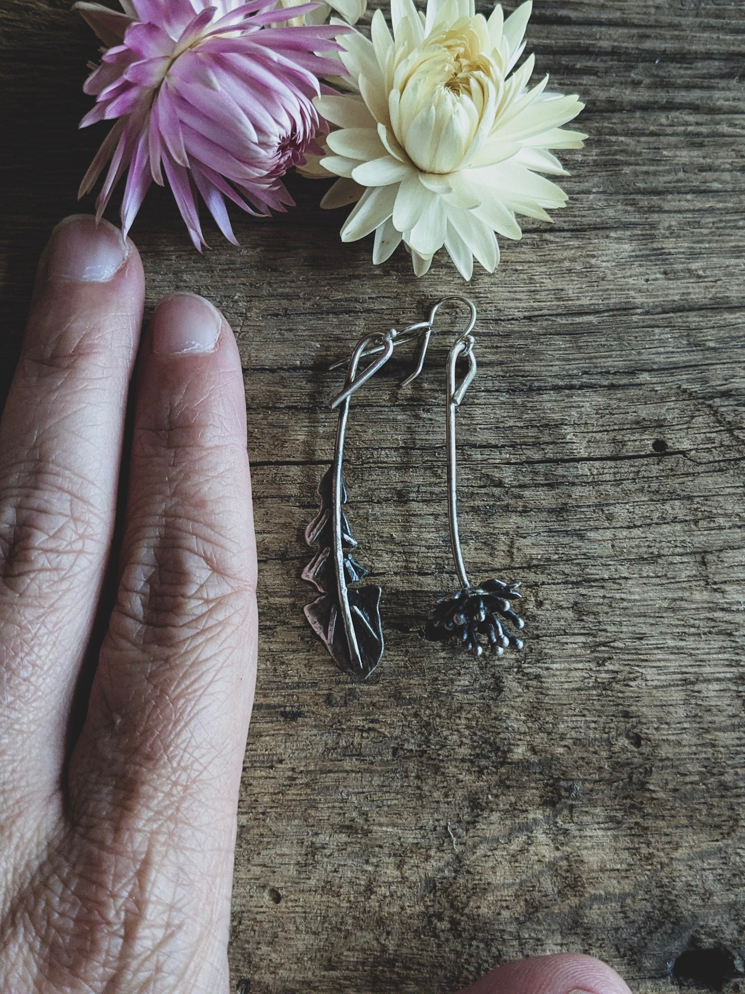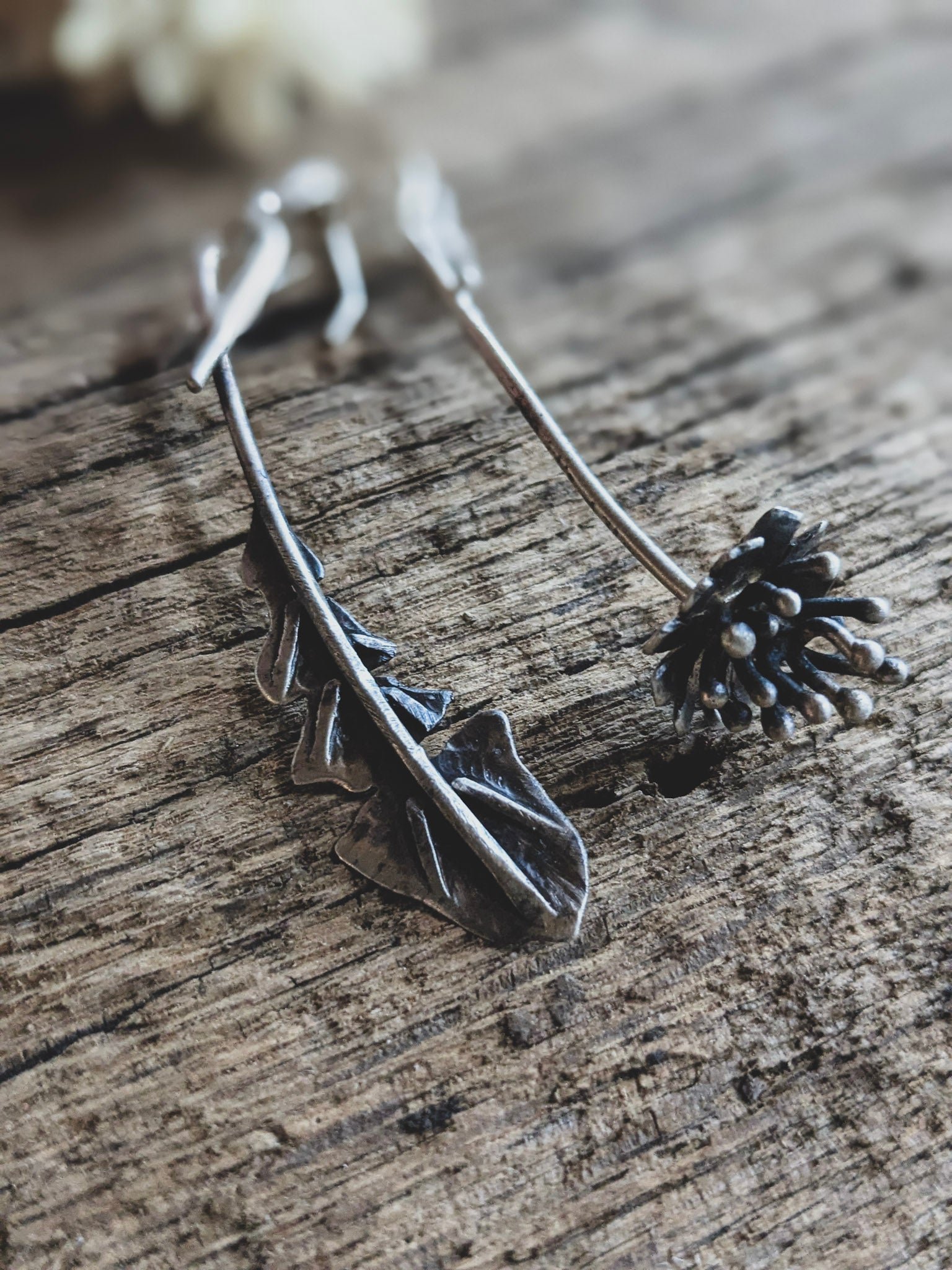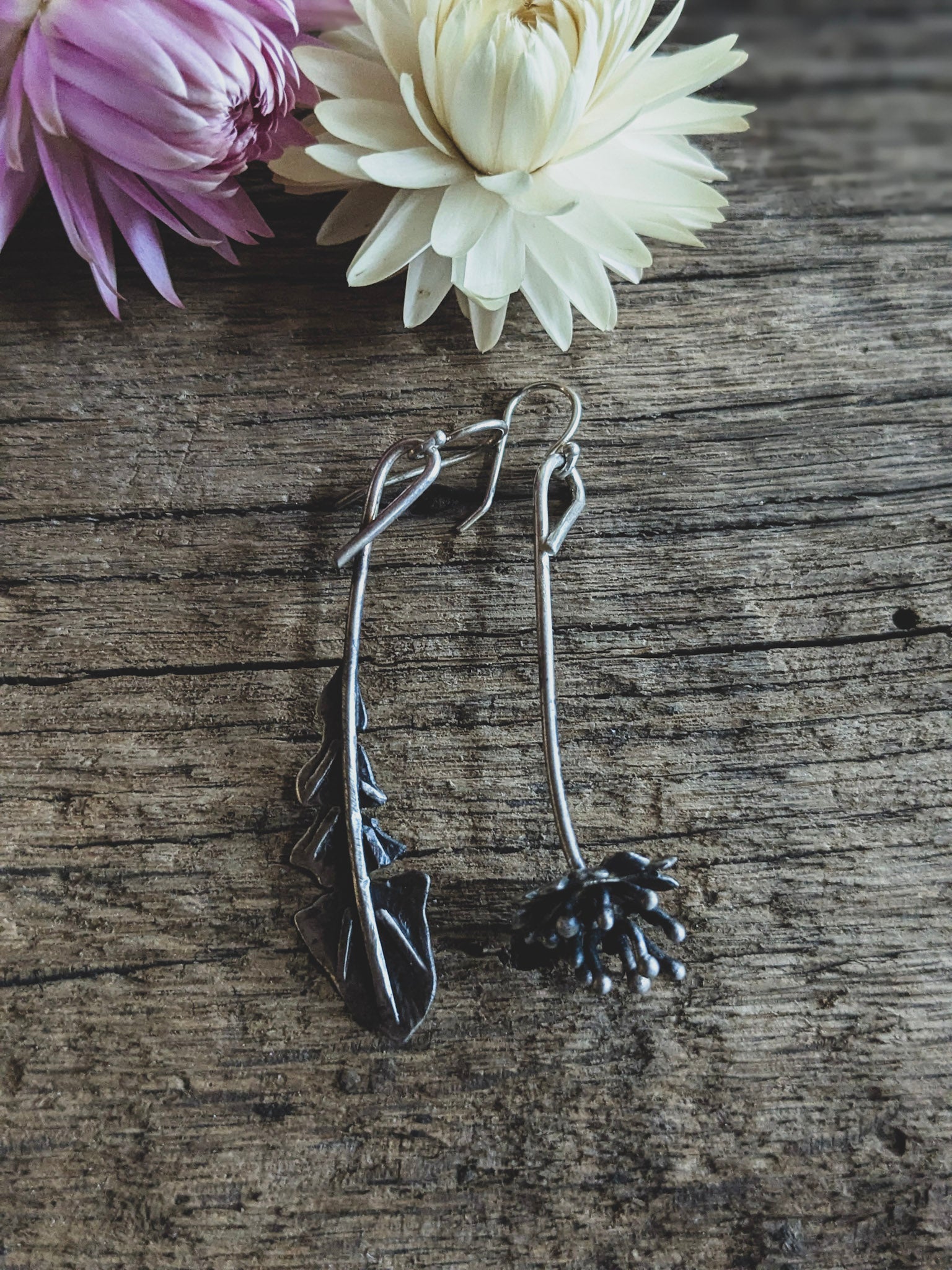 Celebrate the quiet poetry of wild plants with these handmade asymmetrical earrings inspired by the dandelion in two stages: one earring shaped like a delicate dandelion leaf, the other like a dandelion flower gone to seed.