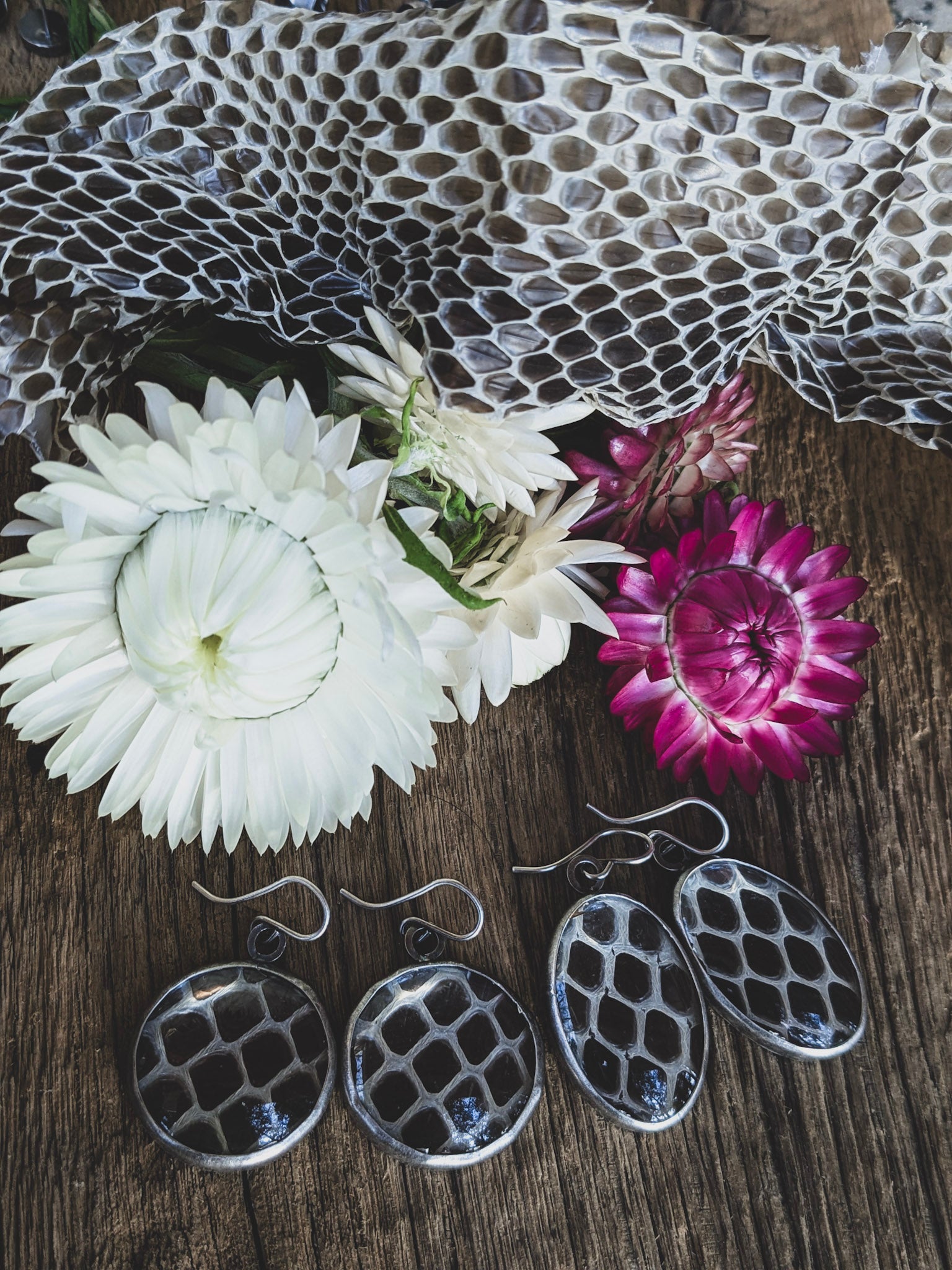 Bold, mysterious, and unapologetically raw—these handmade dangle earrings capture the quiet power of transformation. Set behind polished clear cabochons, real shed blacksnake skin is preserved in stunning detail, framed in heavy sterling silver with a choice of oval or circle silhouettes. No animals were harmed - snakes naturally shed their skin.