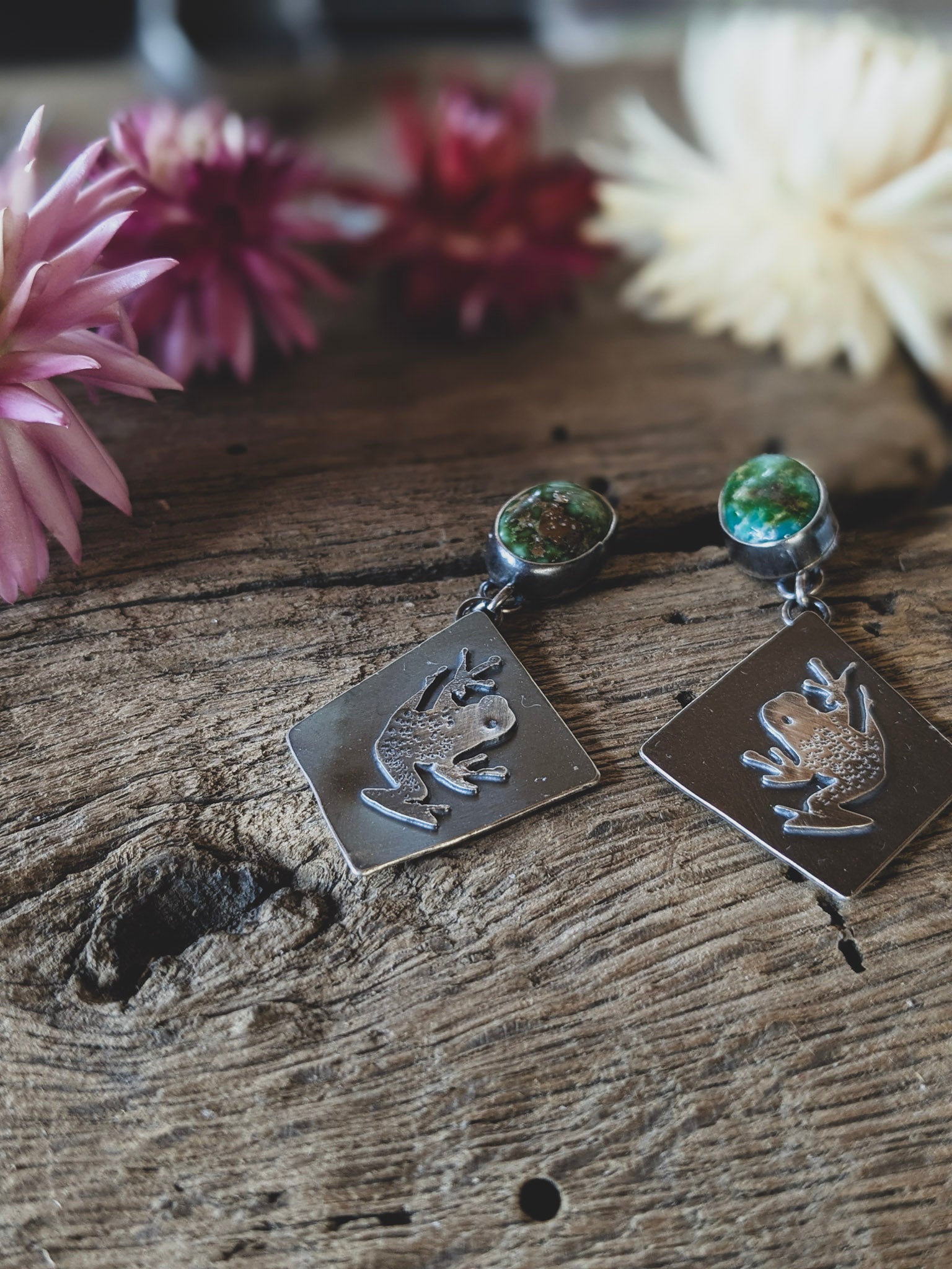 At the top, natural Sonoran Gold turquoise adds a bold splash of green and blue with warm golden matrix, evoking lush canopies and sun-dappled forest floors. The playful frogs below bring charm, balance, and a touch of the wild to your look.